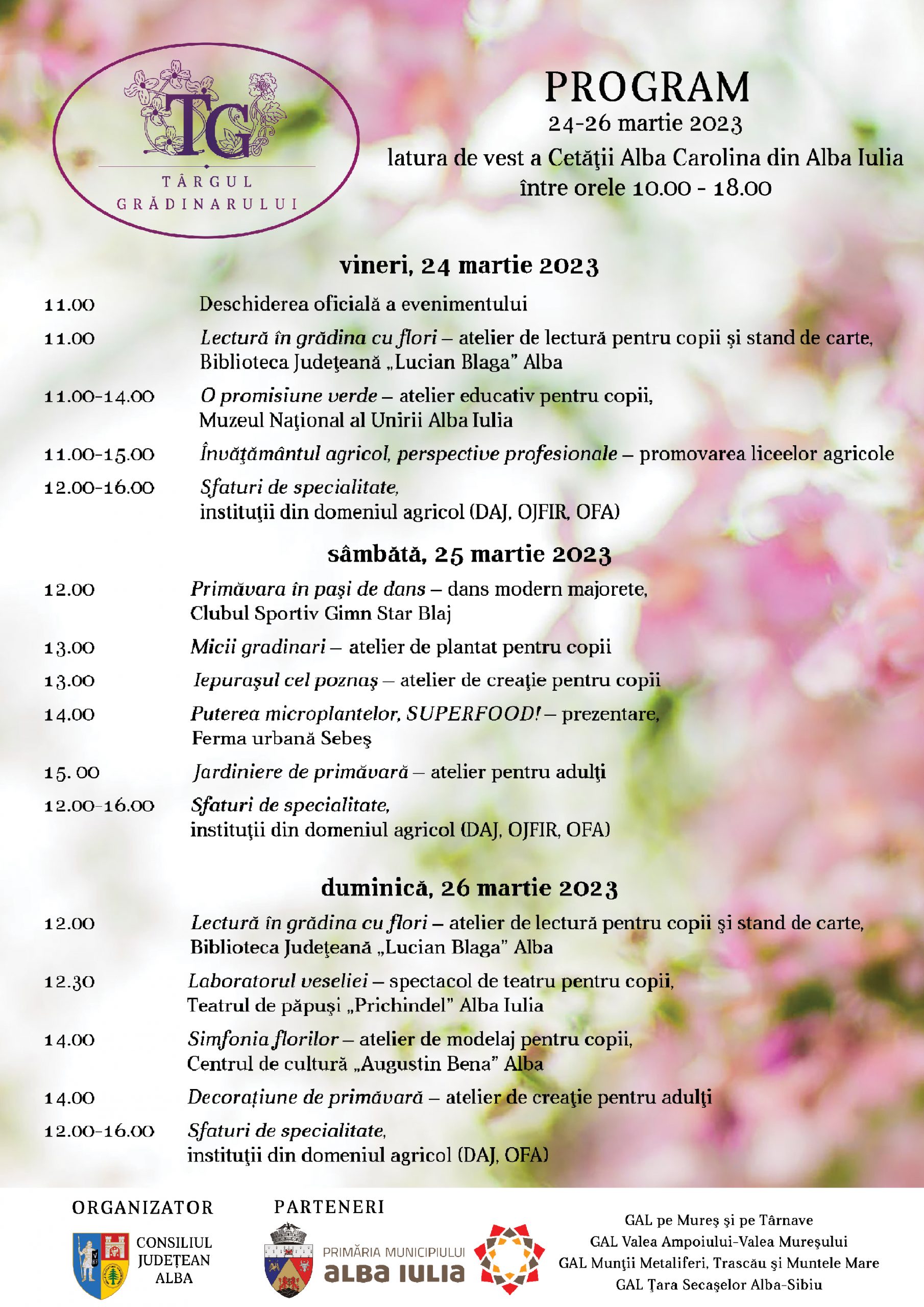 Pe parcursul celor trei zile veţi găsi numeroase idei de amenajare, sfaturi practice de la specialişti şi produse de la producători locali: butaşi de trandafiri, pomi şi arbuşti fructiferi sau ornamentali, mobilier de grădină, unelte pentru grădinărit şi muuuulte flori.